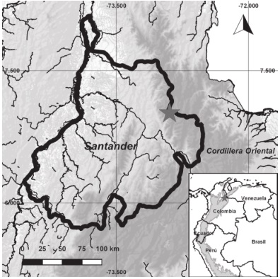El área de estudio se ubica geográficamente en 7°00’57.4” N, 72°53’51.4” O sobre el flanco occidental de la Cordillera Oriental en el municipio de Santa Bárbara, Santander, Colombia (Fig. 1). Esta zona presenta una precipitación anual aproximada de 1,230 mm (Fig. 2), con un régimen de lluvias bimodal con 2 periodos altos (de abril a mayo y de septiembre a noviembre) y 2 periodos bajos (de junio a agosto y de diciembre a marzo) (Alcaldía de Santa Bárbara, 2015). La vegetación corresponde a un bosque Andino, constituido por árboles de gran porte donde se destaca la abundancia del roble (Quercus humboldtii).
