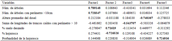 De las 17 variables estructurales de la vegetación que fueron medidas, 7 fueron las más importantes en el análisis de componentes principales (PCA) las cuales se representaron en 5 factores con una varianza acumulada del 68.5% (Tabla 1).