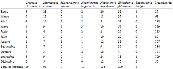En general, la abundancia de individuos cambió significativamente a través del tiempo (x 2= 59.92; p < 0.0001), siendo enero y mayo los meses con mayor número de capturas, mientras que julio, octubre y diciembre fueron los meses en los que se capturaron un menor número de individuos (Tabla 2). Sin embargo, al hacer el análisis para cada una de las especies, se encontró que las abundancias de C. cf. tamensis (x 2 = 13.86; p < 0.19) y N. bogotensis (x 2 = 4.35; p < 0.96) no variaron significativamente lo largo del tiempo de muestreo. Solo para la especie más abundante, es decir, R. fulviventer, se constató una relación significativa positiva con la precipitación (r2 = 0.89; p < 0.04).