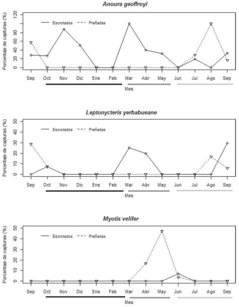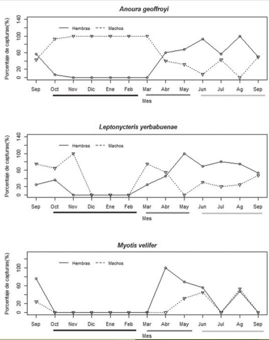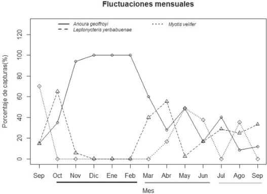 Se capturaron un total de 352 individuos, de los cuales 130 correspondieron a individuos de A. geoffroyi (55 hembras y 75 machos), 118 de L. yerbabuenae (62 hembras y 57 machos) y 104 de M. velifer (68 hembras y 36 machos). Se presentaron cambios mensuales en el porcentaje de individuos capturados de las 3 especies a lo largo del año de muestreo (Fig. 1). A. geoffroyi fue la única especie residente (Fig. 1). Las 2 especies restantes no estuvieron presentes en las cuevas en la estación seca/ fría (Fig. 1).
