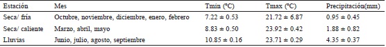 Los datos de temperatura y precipitación diaria de septiembre de 2014 a septiembre de 2015 se obtuvieron a través de la Comisión Nacional del Agua (Conagua). Dentro del área de estudio se describen 3 estaciones: seca/ fría, seca/ cálida y lluvias (Tabla 1).