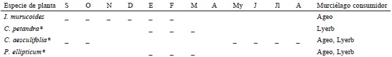 La floración de I. murucoides se presentó de septiembre a febrero (Tabla 2) meses que corresponden al final de la estación lluviosa y en la estación seca/ fría (Tabla 1). El periodo de floración de esta planta coincidió con la presencia de machos reproductivos de A. geoffroyi y con la ausencia de hembras (Figs. 2a, 3a). Encontramos que las especies de plantas que son polinizadas por murciélagos alrededor de la región fueron Ceiba petandra, Ceiba aesculifolia y Pseudobombax ellipticum. La floración de C. petandra y P. ellipticum es al final de la estación seca/ fría e inicio de la seca/ caliente. Mientras que C. aesculifolia está en floración al final de la seca/ caliente y lluvias (Tabla 1). El patrón reproductivo de machos de A. geoffroyi coincidió con algunos meses de floración de C. petandra, C. aesculifolia y P. ellipticum y el de las hembras con algunos meses de C. aesculifolia. Por otra parte, la actividad reproductiva de L. yerbabuenae parece coincidir con los primeros meses de floración de I. murucoides y los últimos de C. petandra, P. ellipticum y C. aesculifolia.