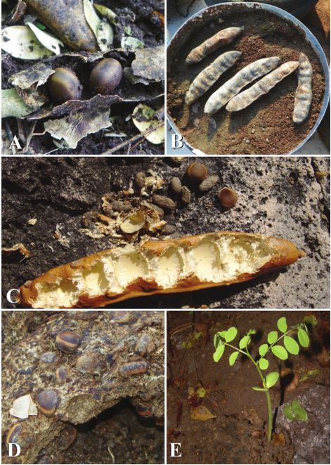 En condiciones de campo (bajo árbol madre) o en la casa sombra, ninguna semilla germinó, en ninguno de los tratamientos (semillas fuera de frutos, semillas en el interior de las vainas intactas o parcialmente abiertas). Durante la época de secas, todos los frutos y semillas permanecieron en la misma condición y posición en la que habían sido colocados. En la época de lluvias, algunos frutos y las semillas contenidas en éstos se infestaron superficialmente de hongos y no se observó su desintegración (Fig. 2B); estos hongos no se registraron en las semillas que se encontraban fuera de los frutos.