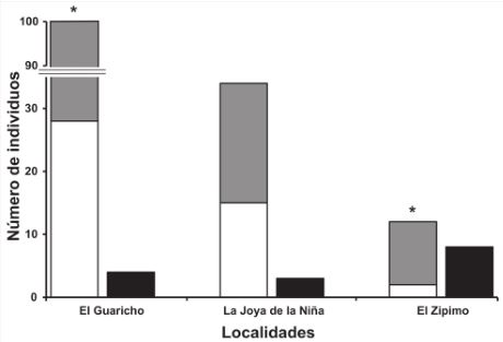 En las 3 localidades se registró un total de 161 individuos, 15 reproductivos y 146 no reproductivos. Tomando en cuenta que el área de muestreo en cada sitio fue de 0.1 ha, la mayor densidad poblacional se registró en El Guaricho, con 104 individuos (4 reproductivos y 100 no reproductivos), seguido de La Joya de la Niña y El Zipimo, con 37 (3 reproductivos y 34 no reproductivos) y 20 individuos (8 reproductivos y 12 no reproductivos), respectivamente. Del total de individuos registrados, el 91% se categorizó como no reproductivo (n = 142 individuos). Para éstos, en El Guaricho y El Zipimo, fueron más los que se categorizaron como individuos dispersados (El Guaricho: χ 2 = 18.49, gl = 1, p < 0.0001; El Zipimo: probabilidad exacta binomial, p = 0.019; Fig. 3). En La Joya de la Niña la proporción de dispersados fue igual a lo esperado por azar (χ 2 = 0.26; gl = 1; p = 0.47). En las 3 localidades los individuos no reproductivos presentaron una distribución significativamente agrupada (El Guaricho, Id = 1.47, p < 0.05; La Joya de la Niña, Id = 1.74, p < 0.05; El Zipimo, Id = 2.19, p < 0.05).