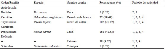 Con un esfuerzo de muestreo total de 3,282 días-trampa, se obtuvo un total de 466 fotocapturas de mamíferos terrestres. Se identificaron 15 taxones, 14 a nivel de especie y 1 a nivel de orden; 6 especies se categorizaron como consumidoras (Tabla 1). Los mamíferos que manipularon los frutos fueron animales herbívoros/frugívoros (vacas, venados cola blanca, pecarís de collar y coatís) o granívoros (ratones y cuiniques). En el primer caso, los individuos fueron fotografiados con el fruto en la boca (e.g., venado cola blanca; Fig. 1C) o entre sus patas delanteras (e.g., coatí), mientras que en el segundo, los animales se registraron transportando los frutos en la boca o abriéndolos (e.g., N. adocetus). Los coatís, pecarís y venados fueron las especies de mamíferos consumidoras registradas con mayor frecuencia (168, 102 y 77 fotocapturas, respectivamente).