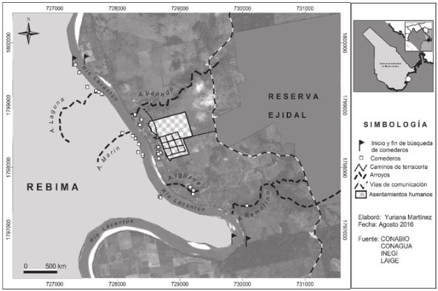 Entre enero y junio de 2016 se llevaron a cabo 6 visitas al área de estudio con intervalos de alrededor de 28 días. En la REBIMA se realizaron solamente 5 visitas debido a las condiciones ambientales adversas como la creciente del río Lacantún y limitaciones de transporte para el acceso a la misma. En cada área se estableció una franja de ancho fijo de 50 × 3,000 m a lo largo del río Lacantún, lo que corresponde a la longitud territorial aproximada del ejido Reforma Agraria.