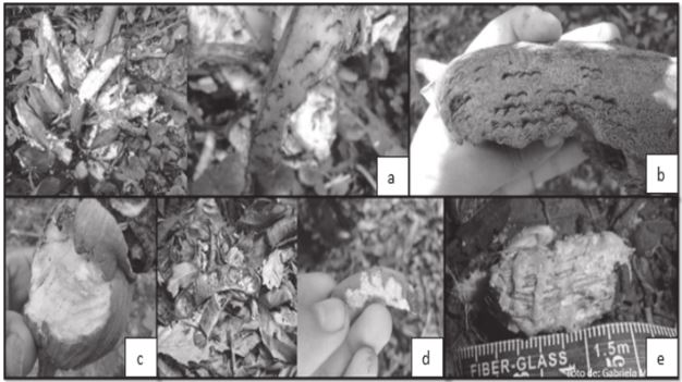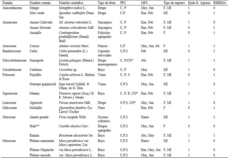 La dieta del tepezcuintle registrada en el área de estudio incluyó frutos de 20 especies de árboles (Tabla 3), de las cuales solo 6 están presentes en la REBIMA, 9 solo en Reforma Agraria y 5 en ambos sitios. Se encontró que el 40% de las especies arbóreas consumidas por el tepezcuintle son las mismas en ambos sitios. El consumo de frutos de hule y ceiba son nuevos registros para la dieta del tepezcuintle en vida silvestre. De las 20 especies registradas, 4 de ellas (plátano manzanita, M. paradisiaca var. Musa sapientum, ceiba, guatope cuajinicuil, Inga inicuil; calabaza, Cucurbita sp. y jobo verde Spondias radlkoferi) fueron identificadas solo por las marcas de incisivos del tepezcuintle (Fig. 2).
