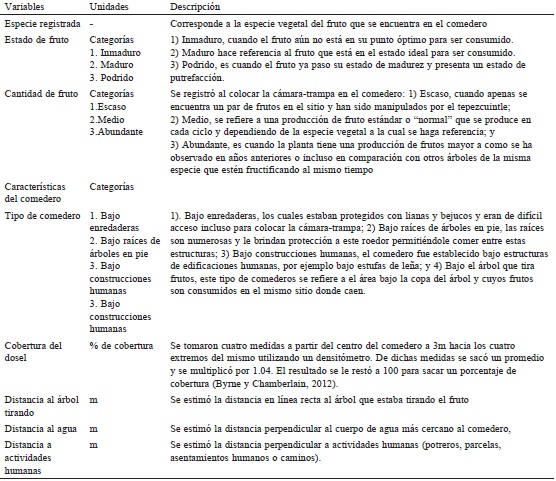 Una vez localizados los comederos, se caracterizaron a través de atributos como: tipo de comedero (bajo enredaderas, bajo raíces de árboles en pie, bajo el árbol que tira el fruto y bajo construcciones humanas), especie, estado de maduración y cantidad de frutos, cobertura del dosel, distancias al árbol que está fructificando, al agua y a actividades humanas (caminos, potreros, asentamientos humanos; Tabla 1). En cada comedero se establecieron de 1-2 cámaras trampa Cuddeback Black Flash Modelo E3, que se programaron para estar activas las 24 h del día capturando videos de 30 seg de duración con intervalos de 15 seg entre capturas. Estas cámaras se revisaron cada 28 días aproximadamente y su permanencia en el comedero dependió de la actividad de los tepezcuintles en el mismo, dejando las cámaras activas mientras el tepezcuintle visitara el comedero. Las especies arbóreas que resultaron ser compartidas en ambos sitios (mamey Pouteria sapota, ramón Brosimum alicastrum y corozo Attalea butyracea), se tomaron en cuenta para describir los hábitos alimentarios del tepezcuintle.