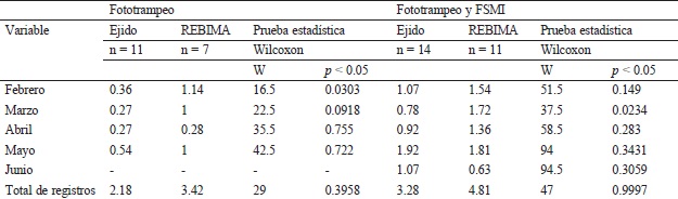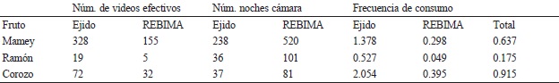 La frecuencia de consumo de frutos que se registró mediante los videos obtenidos por fototrampeo, añadiendo los FSMI solo mostraron diferencias significativas entre sitios en febrero y marzo con W = 16.5; p = 0.03 y W = 37.5; p = 0.02, respectivamente (Tabla 4). En cuanto a las especies arbóreas presentes en ambos sitios, la frecuencia de consumo fue mayor en los comederos de corozo (0.915 videos/noches cámara) respecto a los de mamey y ramón con 0.637 y 0.175 videos/noches cámara, respectivamente (Tabla 5).