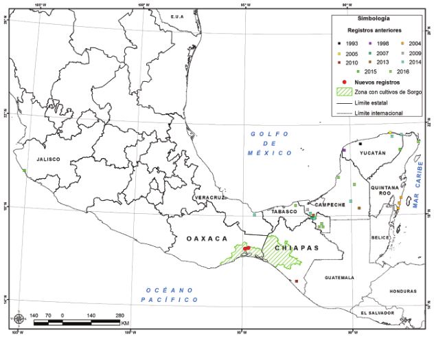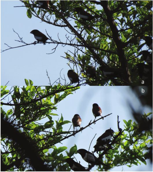 El presente trabajo muestra la ampliación del rango de distribución en 8 estados de nuestro país y el primer registro de L. malacca en Oaxaca; reportando 2 avistamientos en el istmo de Tehuantepec (Fig. 1), el primero el día 20 de junio de 2016 cercano a la comunidad Santo Domingo Ingenio, municipio de Santo Domingo, Oaxaca (16°35’33.68” N, 94°43’49.51” O). Este mismo día, entre las 11:00 y 11:30 am se detectaron 2 individuos en un terreno cercano a cultivos de sorgo y maíz. El segundo avistamiento tuvo lugar en Piedra Larga, municipio de Unión Hidalgo (16°33’3.19” N, 94°53’8.83” O) el 7 de julio de 2016, alrededor de las 8:00 y 8:30 am; en esta ocasión, fueron contabilizados un total de 38 individuos en un potrero aledaño a terrenos cultivados con sorgo. Los avistamientos se realizaron con binoculares Kowa SV 8 × 42 y las fotografías (Fig. 2a, b) fueron tomadas con cámara Canon HD 35X Optical Zoom 35X.