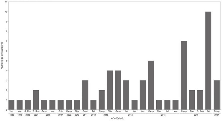 La UICN (2016) no considera a México dentro de los mapas de distribución de L. malacca a pesar de que la especie se ha expandido hasta el estado de Jalisco (Fig .1). Algunos datos sobre el año y número de avistamientos en México se muestran en las Figuras 1 y 3, donde se puede observar que los estados con mayor número de avistamientos son Chiapas, Campeche y Tabasco. La tendencia muestra que se ha incrementado el número de avistamientos de 1993 a 2017 y en el caso de los estados de Campeche y Tabasco, hay un incremento importante si consideramos que el promedio de avistamientos por estado ha sido de casi 2.5 en el periodo 1993-2017 (24 años). Considerando este periodo, es preciso mencionar que de acuerdo con la MEA (2005), las especies invasoras pueden tener un impacto significativo en un periodo de 50-100 años. Es importante señalar los avistamientos en Palizada, Campeche y Balancán, Tabasco, los cuales son municipios con categoría de muy alta y alta producción de arroz (Siap, 2016). De acuerdo con Certuche-Cubillos et al. (2010), L. malacca prefiere consumir arroz debido a su alto contenido nutricional; sin embargo, puede consumir otras especies de gramíneas y tiene potencial para establecerse en ambientes con poca abundancia de arroz, lo cual representa una ventaja que le confieren gran capacidad para convertirse en una plaga de cultivos de importancia comercial. Sørensen et al. (2003), concluyen que el carácter de plaga de esta especie está relacionado con la densa cobertura de malezas presente en los campos de arroz y los canales de drenaje, lo cual constituye un hábitat idóneo para su anidamiento y cría.