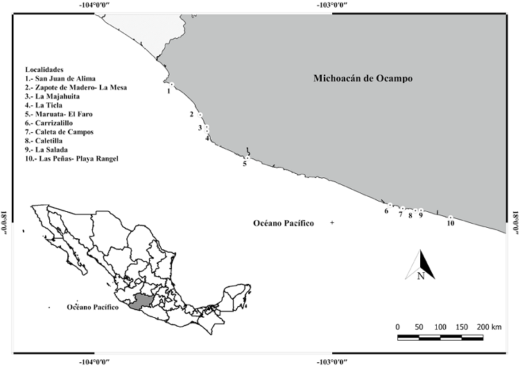 El estado de Michoacán forma parte del litoral de la República Mexicana en el Pacífico tropical mexicano (PTM) tiene una longitud de 247 km, lo que representa el 2.9% de línea costera total del país. Su litoral abarca desde la “Boca de Apiza” del río Coahuayana hasta la “Boca de San Francisco” al este del delta del río Balsas (Correa, 1974), entre los 20°23’27” y 17°53’57” N, 100°03’32” y 103°44’49” O (Fig. 1). Pertenece a la región costa suroccidental del Pacífico mexicano, limita al noroeste con la bahía de Banderas, Jalisco, hasta Mazunte, cerca de Puerto Ángel en Oaxaca. Son costas tectónicas de colisión con gran abundancia de cantiles y de puntas rocosas y pequeñas bahías. Hay algunos ríos que llegan a la costa y casi una total ausencia de cuerpos de agua costeros (Ortiz-Pérez y de la Lanza-Espino, 2006). Michoacán posee 3 regiones hidrológicas: Balsas, Lerma-Santiago y Costas de Michoacán El clima del área corresponde al subtipo Aw 1 (W), es decir, cálido subhúmedo con 2 periodos de lluvia separados por sequías intraestivales; las lluvias de verano son abundantes, las invernales escasas (menos del 5% del total anual). La temperatura es relativamente alta (mínima invernal de 18° C). La precipitación pluvial anual es de 600 a 800 mm (García, 1983). La estación de lluvias se presenta de mayo a octubre y la de secas de noviembre a abril. El régimen de mareas es micromareal mixto, presentándose generalmente 2 pleamares y 2 bajamares, con una amplitud de alrededor de 0.27 metros (Grivel, 1983).