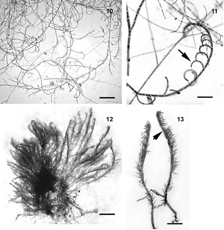 Comentarios: los especímenes asignados a C. crispula concuerdan perfectamente con lo descrito por Alves et al. (2012) para Bahia, Brazil. De acuerdo con van den Hoek (1982), las células en C. crispula son uniformes en diámetro a lo largo del talo, una característica observada tanto en material mexicano como en el de Brazil. Cladophora crispula comparte características con C. laetevirens (Dillwyn) Kützing con respecto a la arquitectura del talo, dimensiones de las células y la forma de las células apicales, pero difiere por su talo enmarañado con filamentos apicales fuertemente curvados.