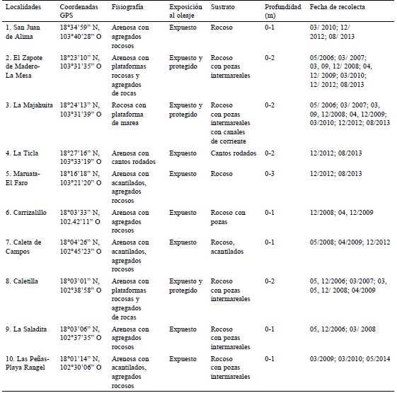 Por lo que respecta a La Ticla, Caleta de Campos y La Saladita, la riqueza específica fue baja (6, 14 y 13 taxones, respectivamente), comparada con las otras localidades, esto puede atribuirse a que las playas son mayormente arenosas y con formaciones rocosas expuestas a intenso oleaje. En el caso de San Juan de Alima, Maruata-El Faro y Las Peñas-Playa Rangel se ubicaron 18, 15 y 19 taxones, respectivamente, a pesar de que en las 3 localidades se encuentran formaciones rocosas, éstas se muestran como una zona de mar abierto fuertemente expuesta al oleaje durante la resaca de las olas, en las bajamares y pleamares.