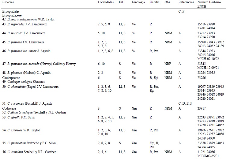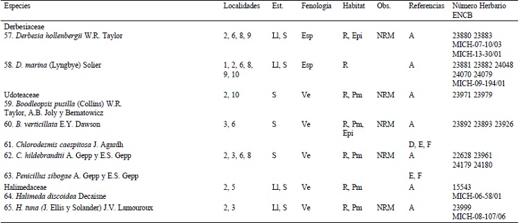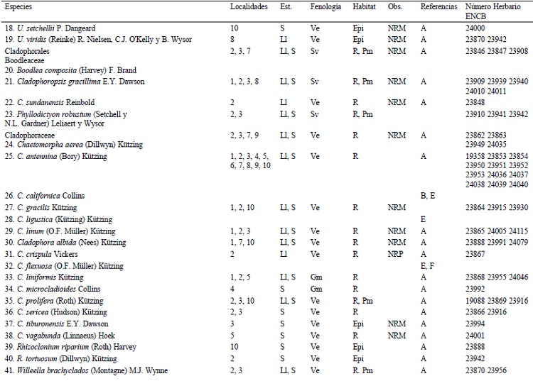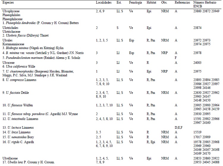 En el Tabla 2 se indican las especies ubicadas en este estudio según la clasificación de Wynne (2017) y Guiry y Guiry (2018), con su distribución en las 10 localidades exploradas, así como la estacionalidad, reproducción, hábitat y número de colección del herbario ENCB. Las familias mejor representadas de acuerdo al número de taxa fueron Cladophoraceae (15) y Ulvaceae (10). Siguen en importancia Bryopsidaceae (6), Codiaceae (5) y Boodleaceae (4). También se ubicaron especies de Chaetophoraceae, Halimedaceae, Phaeophilaceae, Udoteaceae y Ulvellaceae representadas por 1 o 3 especies (Tabla 2).
