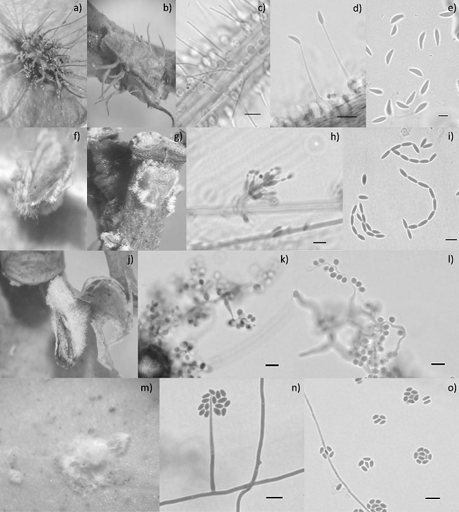 Hirsutella citriformis fue el hongo con mayor incidencia y distribución, se encontró en todos los huertos muestreados infectando adultos, aunque en el verano de 2014 se encontraron 3 ninfas infectadas por H. citriformis en la comunidad de Coalatilla en Armería, siendo el primer reporte de infección de esta especie sobre ninfas en México. Los PAC infectados con este hongo se encontraban adheridos a hojas y ramas en limón y limonaria, cubiertos por micelio blanco a grisáceo, su característica particular fue la presencia de sinemas largos y cilíndricos de tamaño variable que emergían del tórax del insecto, en algunos casos ramificados, regularmente con protuberancias cónicas en la base del sinema (Fig. 1a, b). La estructura conidiógena mostró forma de botella con la base ensanchada y la parte distal con un cuello delgado y alargado, distribuidas a lo largo del sinema (Fig. 1c, d) y los conidios mostraron una forma fusiforme (Fig. 1e).