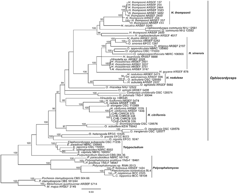 Del material recolectado se obtuvieron 19 aislados que se registraron con los acrónimos CHE-CNRCB 328, 329, 330, 331,332, 333, 335, 337, 338, 339, 340, 341, 342, 345, 346, 347, 350 y 360, todos ellos de adultos y el aislado 375 obtenido a partir de ninfas del psílido. Considerando la morfometría de 5 aislados, presentaron variabilidad en sus dimensiones (Tabla 3). La longitud de las fiálides mostraron un intervalo de 24.61 - 29.32 µm de cuello y la base de las fiálides mostró valores entre 5.82 - 6.73 µm. Las dimensiones de los conidios fueron de 6.95 - 7.68 × 2.09 - 2.54 µm (largo × ancho). El análisis filogenético por IB derivada de la concatenación de las regiones SSU, TEF y RPB1 de las muestras de Hirsutella spp. mostró que los aislados CHE-CNRCB 335, 338, 339 y 375 forman parte del clado de H. citriformis y en el que se incluyen los 2 aislados H. citriformis ARSEF 1035 y ARSEF 1446 (Fig. 2). La rama tiene un apoyo fuerte y significativo de 100% de probabilidades posteriores por IB (PP IB).