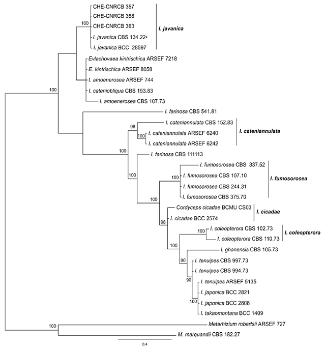 Isaria javanica. Durante los muestreos de campo se encontraron ninfas y adultos del PAC infectadas con I. javanica en 2 huertos de limón del municipio de Tecomán, los insectos momificados tenían apariencia polvosa grisácea. Los adultos momificados se observaron adheridos al follaje en posición de alimentación con el abdomen cubierto por el hongo (Fig. 1f). En ninfas se observó micosis en la parte ventral sobresaliendo por sus costados (Fig. 1g). Se obtuvieron 5 aislados CHE-CNRCB 356, 357, 358, 359 y 363. La morfología de las células conidiógenas fue en forma de botella con la porción basal ensanchada con un ahusamiento que da origen a un cuello característico (Fig. 1h), las dimensiones de las fiálides fueron de 5.5 × 2.3 µm (4.6 - 6.3 ± 0.45 × 1.7 - 2.9 ± 0.29 µm, n = 90) y los conidios en cadenas de forma cilíndrica a fusiforme (Fig. 1i) de 4.5 ×1.6 µm (4.0 - 5.4 ± 0.41 × 1.3 - 2.0 ± 0.15, n = 90), características acordes con la especie I. javanica (Gallou et al., 2016). Los análisis filogenéticos individuales por IB de las regiones ITS y TEF de las cepas de Isaria spp. mostraron que los aislados CHE-CNRCB 357, 358 y 363 forman parte del clado de I. javanica y en el que se incluye el aislado de referencia tipo I. javanica CBS 134.22 (Fig. 3). Para las 2 regiones, las ramas tienen un apoyo significativo de 100% de PP IB.