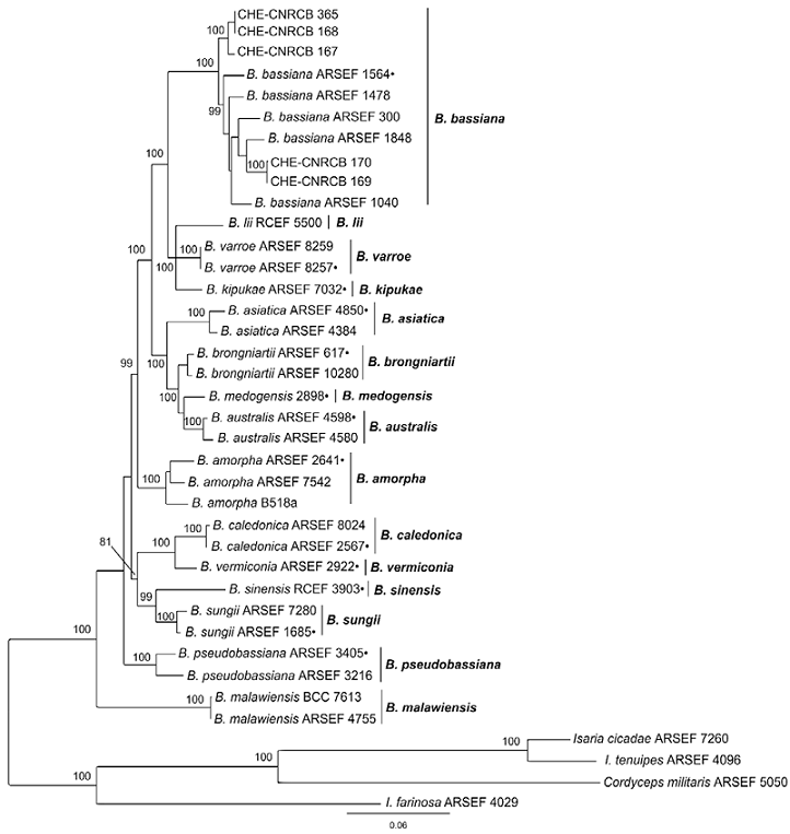 Beauveria bassiana. Se recolectaron adultos de D. citri infectados con B. bassiana en plantas de M. paniculata y en huertos de limón en los municipios de Armería y Tecomán, los insectos mostraron crecimiento micelial en el abdomen que se fue tornando polvoso, de coloración blanca a amarillo cremoso (Fig. 1j). Se observaron estructuras de reproducción asexual típicas del género, micelio septado con un diámetro de 1.8 µm (1.3 - 2.3 ± 0.29, n = 40), células conidiógenas de 2.42 µm (1.8 - 3.3 ± 0.33, n = 90) con una base globosa en forma de botella adelgazadas en la parte superior, formando un raquis curveado en zig-zag que se extiende apicalmente con un conidio por dentículo (Fig. 1k); conidios globosos a sub-globosos (Fig. 1l) de 2.5 × 2.2 µm (2.1 - 3 ± 0.23 × 1.9 - 2.6 ± 0.15, n = 90). Cinco aislados fueron obtenidos (i.e., CHE-CNRCB 167, 168, 169, 170 y 365). El análisis filogenético por IB derivada de la concatenación de las regiones Bloc, TEF e ITS de las muestras de Beauveria spp. mostró que los aislados CHE-CNRCB 167, 168, 169, 170 y 365 forman parte del clado de B. bassiana y en el que se incluye el aislado de referencia tipo B. bassiana ARSEF 1564. La rama tiene un apoyo fuerte y significativo de 100% de PP IB. Sin embargo, dentro de la especie B. bassiana se observaron 2 clados distintos con un apoyo del 100% y del 99% de PP IB, separando los aislados CHE-CNRCB 167, 168 y 365 de los aislados CHE-CNRCB 169, 170 y ARSEF 1564. Esta diferencia genética fue soportada únicamente por la región intergénica nuclear Bloc, la cual fue desarrollada inicialmente para realizar investigaciones de especiación críptica de B. bassiana (Rehner et al., 2006) y posteriormente utilizada en un análisis filogenético multilocus para evaluar la diversidad del género Beauveria y el estatus taxonómico de sus especies (Rehner et al., 2011). Por ejemplo, la secuencia Bloc del aislado CHE-CNRCB 365 presentó 96% de similitud (1,452/1,510 pb) respecto a la secuencia Bloc del aislado tipo ARSEF 1564 (EF222317), mientras que las secuencias ITS y TEF del mismo aislado presentaron más de 99% de similitud (515/519 pb y 984/986 pb, respectivamente) con las secuencias ITS (NR_111594) y TEF (HQ880974) del aislado tipo ARSEF 1564. Adicionalmente, el análisis realizado con la herramienta “basic logic alignment tool” (BLAST) en la base de datos del National Center for Biotechnology Information (NCBI) mostró que la secuencia Bloc del aislado CHE-CNRCB 365 presentó 100% de similitud con la secuencia Bloc del aislado B. bassiana ARSEF 1966 (DQ384384), confirmando su identificación como B. bassiana. Debido a lo anterior, el contenido de linajes hermanos o como se observa en la Figura 4, la presencia de clados dentro de la especie B. bassiana sugiere una gran variación intraespecífica que es determinada principalmente por la región intergénica Bloc.