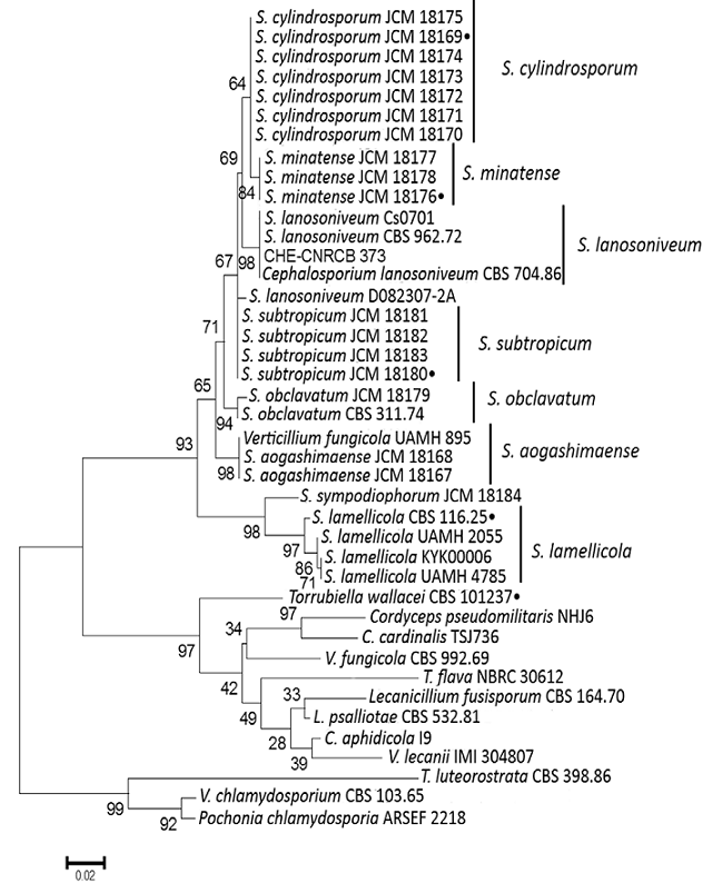 El género Simplicillium tiene parentesco con el género Lecanicillium, ambos géneros producen fiálides delgadas en forma de espina, conidios que se adhieren en cabezas viscosas mucilaginosas o formando cadenas. Simplicillium y Lecanicillium se pueden distinguir por la disposición de fiálides, el primero generalmente posee una disposición de fiálides solitarias con poca diferencia entre las hifas, mientras que este último tiene fiálides verticiladas. Los caracteres morfológicos del aislamiento CHE-CNRCB 373 coinciden con la descripción de S. lanosoniveum (Zare y Gams, 2001), en este género se incluyen aislados de diversos artrópodos, otros hongos y suelo (Bałazy et al., 2008; Nonaka et al., 2013; Zare y Gams, 2001). Se reporta por primera vez la presencia de S. lanosoniveum sobre D. citri.