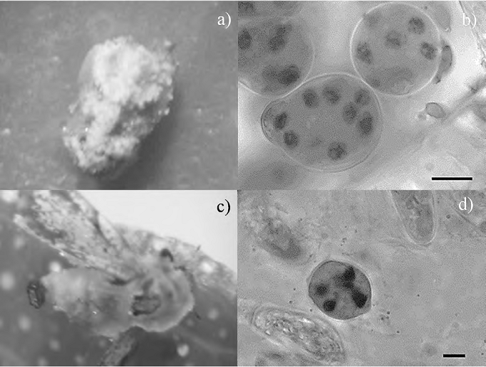 El género Batkoa se encontró sobre ninfas de D. citri, el crecimiento del hongo exhibió una textura granulosa dando la apariencia que se encontraba cubierta por azúcar (Fig. 6a), con conidios primarios subesféricos con una papila característica de la especie (Fig. 6b), con dimensiones de 29.5 ± 2.5 µm de largo × 24.14 ± 2 µm (n = 15) ancho, conteniendo un promedio de 8 núcleos por conidio con un diámetro de 4.25 ± 0.67µm (n = 60). No se logró aislar este género por lo cual no se realizó el análisis molecular correspondiente.