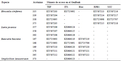 El ADN genómico de la mayoría de los aislados fue extraído a partir de 10 mg de micelio liofilizado y macerado con un balín de tungsteno (3 mm) o acero (5 mm) en el equipo TissueLyser II™ (Qiagen Valencia, USA) y usando el kit DNeasy Plant Mini (Qiagen, Valencia, USA) de acuerdo a las instrucciones del fabricante. La extracción de ADN de los aislados CHE-CNRCB 373 y 375 se llevó a cabo con 10 mg de micelio liofilizado macerado con nitrógeno líquido en un mortero y el procedimiento convencional descrito por Amer et al. (2011). Los parámetros de calidad del ADN genómico extraído (i.e., pureza, concentración e integridad) se determinaron según Gallou et al. (2016). Acorde con el género, las regiones utilizadas para la identificación fueron las siguientes: la región intergénica Bloc (5.3F/B5.1R; Rehner et al., 2006), el factor de elongación de traducción 1α (TEF) (983F/2218R; Carbone y Kohn, 1999; Rehner y Buckley, 2005) y los espaciadores internos transcritos (ITS) (ITS5/ITS4; White et al., 1990) para los aislados del género Beauveria. Las regiones TEF e ITS para los aislados del género Isaria. La subunidad pequeña ribosomal (SSU) (NS1/NS4; White et al., 1990), la subunidad 1 de la ribopolimerasa II (RPB1) (CRPB1A/RPB1Cr; Castlebury et al., 2004), el TEF y la región ITS para los aislados del género Hirsutella, y la región ITS para el género Simplicillium. La mezcla de reacción de PCR para cada región a amplificar consistió de Polimerasa Phire Hot Start II (Thermo Fisher Scientific, Waltham, USA), 1X del buffer Phire Reaction (ThermoFisher Scientific), 0.2 mM del mix de dNTPs, 0.4 µM de cada primer y 1-20 ng de ADN genómico, ajustados a un volumen final de 25 µL. Los programas de amplificación por PCR se efectuaron como sigue: para Bloc, 1 ciclo de desnaturalización inicial a 98 °C por 30 s, seguido de 35 ciclos de desnaturalización a 98 °C por 5 s, alineación a 56 °C por 5 s y extensión a 72 °C por 22 s, con 1 ciclo de extensión final a 72 °C por 1 min. TEF, 1 ciclo de desnaturalización inicial a 98 °C por 30 s, seguido de 10 ciclos de: 98 °C por 5 s, 66 °C (disminuyendo 1 °C por ciclo) por 5 s y 72 °C por 15 s, en seguida 30 ciclos de: 98 °C por 5 s, 56 °C por 5 s y 72 °C por 15 s y por último, un ciclo de extensión final a 72 °C por 1 min. ITS, 1 ciclo de desnaturalización inicial a 98 °C por 30 s, seguido de 36 ciclos a 98 °C por 5 s, 55 °C por 5 s, 72 °C por 9 s y 1 ciclo de extensión final a 72 °C por 1 min. SSU, 1 ciclo de desnaturalización inicial a 98 °C por 30 s, seguido de 4 ciclos de: 98 °C por 5 s, 55 °C (disminuyendo 1 °C por ciclo) por 5 s y 72 °C por 15 s, continuando con 42 ciclos de: 98 °C por 5 s, 50.5 °C por 5 s y 72 °C por 15 s, con 1 ciclo de extensión final a 72 °C por 1 min. RPB1, 1 ciclo de desnaturalización inicial a 98 °C por 30 s, seguido de 4 ciclos de: 98 °C por 5 s, 47 °C por 5 s y 72 °C por 10 s, continuando con 40 ciclos de: 98 °C por 5 s, 47 °C por 5 s y 72 °C por 10 s, con 1 ciclo de extensión final a 72 °C por 1 min. La purificación de los productos de PCR se realizó con el kit Wizard® SV Gel y PCR Clean-Up System Kit (Promega, Madison, EUA). Para la secuenciación de los amplicones se utilizaron los primers de PCR y en algunos casos, primers adicionales específicos a las regiones Bloc Brint, Bfn6, B822Ldg, B22Udg, Bfn2 y BRn2 (Rehner et al., 2011) y TEF 1577F y 1567R (Rehner y Buckley, 2005) para los géneros Beauveria e Isaria (Macrogen, Seúl, Corea del Sur).