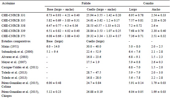 La morfometría de los conidios de H. citriformis es similar a la descrita por Mains (1951), Subandiyah et al. (2000), Álvarez et al. (2003), Meyer et al. (2007) y Toledo et al. (2013) (Tabla 3); sin embargo, mostró mayores dimensiones conidiales que con otras cepas aisladas en México reportadas por Pérez-González et al. (2015). Estos autores afirman que los aislados de H. citriformis recolectados en México presentan variabilidad en las dimensiones de sus estructuras.