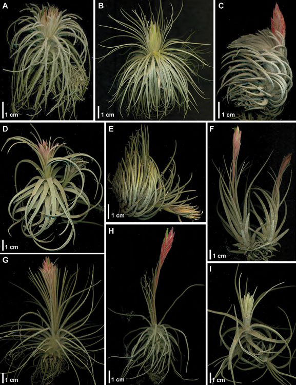 Plantas epífitas, rara vez rupícolas, acaules, a veces cortamente caulescentes, en floración de 5-10 cm de alto, de 4-12 (15) cm de diámetro en su parte más ancha; rosetas solitarias a cespitosas, esféricas en contorno. Hojas más de 35, recurvadas, más cortas que la inflorescencia; vainas pardas pálidas a algo amarillas en ambas superficies, oblongas a obovadas, de (0.5) 1-2 cm de largo, de 0.5-1 cm de ancho, la mitad apical de la superficie adaxial lepidota, tres cuartos apicales de la superficie abaxial lepidota; láminas grisáceas, estrechamente triangulares a lineares, de 3-9 cm de largo, de 2-3.5 mm de ancho, ápice largamente atenuado. Inflorescencia sésil a cortamente pedunculada, erecta, compuesta, con 4-7 espigas; pedúnculo inconspicuo, de hasta 2.5 cm de largo, y 1-5 mm de diámetro, cubierto por las hojas superiores y las brácteas; brácteas del pedúnculo más largas que la inflorescencia; espigas rojo-rosadas, erectas y adpresas al raquis, aplanadas, estrechamente elípticas, de 1.5-3 cm de largo, de 0.5-1 cm de ancho; flores 2-4 por espiga; brácteas florales rojo-rosadas, lanceoladas a estrechamente triangulares, de 1.5-2.5 cm de largo, de 0.5-0.8 cm de ancho cuando extendidas y aplanadas, ápice agudo a cortamente acuminado, conspicuamente nervadas, carinadas, superficie abaxial lepidota; sépalos rojo-rosados hacia el ápice, blanco-verdosos hacia la base, lanceolados, de 1-1.7 cm de largo, de 3-5 mm de ancho cuando extendidos y aplanados, ápice atenuado, al menos los 2 posteriores carinados, esparcidamente lepidotos en la superficie abaxial; pétalos de 1.5-2 cm de largo, de 2-3 mm de ancho, ápice obtuso a subagudo; filamentos de 1-1.5 cm de largo; anteras de color verde claro, de 2-3.5 mm de largo; ovario elipsoide, de 3-4 mm de largo, de 2-3 mm de diámetro, estilo de 0.5-1 cm de largo. Fruto de 2.5-4 cm de largo, de 4-6 mm de diámetro; semillas de 2.5-3.5 mm de largo, coma de 2-2.5 cm de largo.