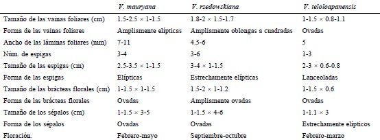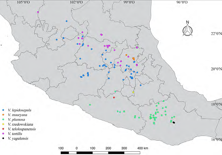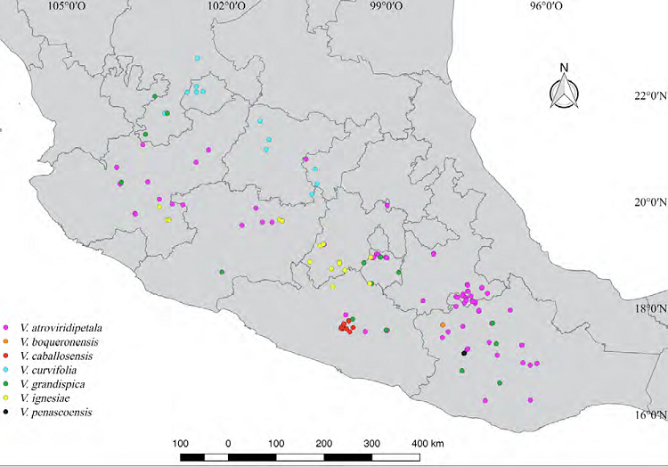 El estado con mayor diversidad es Oaxaca con 7 especies, seguido por Guerrero y Jalisco con 6, mientras que Durango y San Luis Potosí solo presentan 1 (Tabla 1). Los taxones ampliamente distribuidos son: V. atroviridipetala y V. lepidosepala; por otro lado V. boqueronensis, V. penascoensis y V. yagulensis crecen en Oaxaca, V. caballosensis y V. teloloapanensis en Guerrero, V. mauryana es endémica de Hidalgo y V. rzedowskiana de Morelos (Tabla 1; Figs. 3, 4).