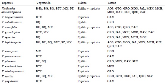 En total se registran 14 especies, incluyendo a Viridantha rzedowskiana Hern.-Cárdenas, Espejo et López-Ferr. especie aquí propuesta como nueva para la ciencia: V. atroviridipetala, V. boqueronensis (Ehlers) Hern.-Cárdenas, Espejo et López-Ferr., V. caballosensis, V. curvifolia, V. grandispica (Ehlers) Hern.-Cárdenas, Espejo et López-Ferr., V. ignesiae, V. lepidosepala, V. mauryana, V. penascoensis, V. plumosa, V. rzedowskiana, V. teloloapanensis (Ehlers y Lautner) Hern.-Cárdenas, Espejo et López-Ferr., V. tortilis y V. yagulensis (Ehlers) Hern.-Cárdenas, Espejo et López-Ferr. (Figs. 1, 2).