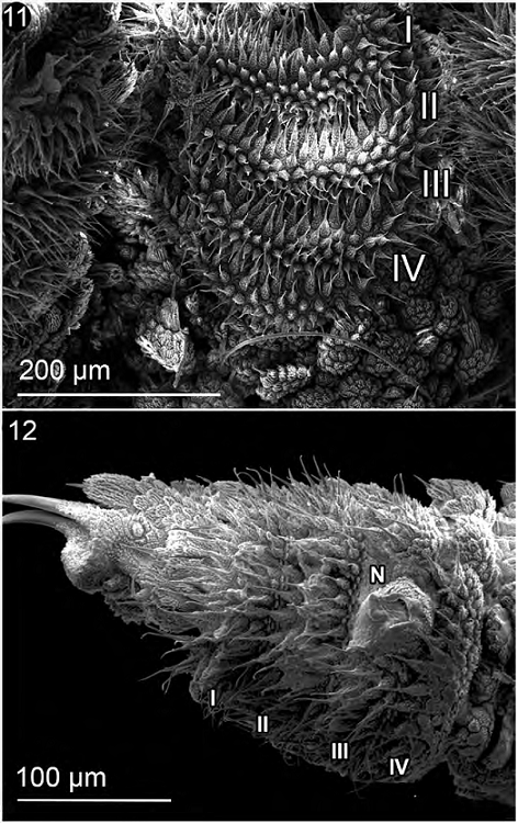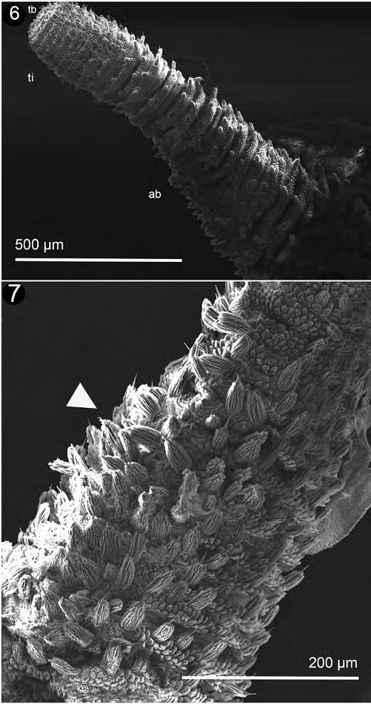 Body dorsum: the dorsomedian furrow is very well defined; without the presence of any hyaline organs. Each body segment has 10 plicae. All plicae have the same width along the body (Fig. 3). Primary and secondary papillae are present on each plicae (Fig. 4). There are never 2 primary papillae together, they always have at least 1 secondary papillae separating them. The primary papillae are aligned longitudinally, with 1 plicae between each primary papillae (Fig. 4). Both papillae occur on the top of the plicae, there is never more than a single line of papillae for each plicae. Primary papillae present a wider, rounded shape at the base, and are shorter than the apical portion (Fig. 5); the apical portion has 4 scale ranks, and these are noticeable longer than the ones on the basal portion. The sensory bristle is on the primary papillae and is larger than the scales (Fig. 5). Accessory papillae are similar in shape to primary papillae. They almost maintain a proportion of 2 to 1 with respect to the primary papillae.