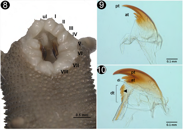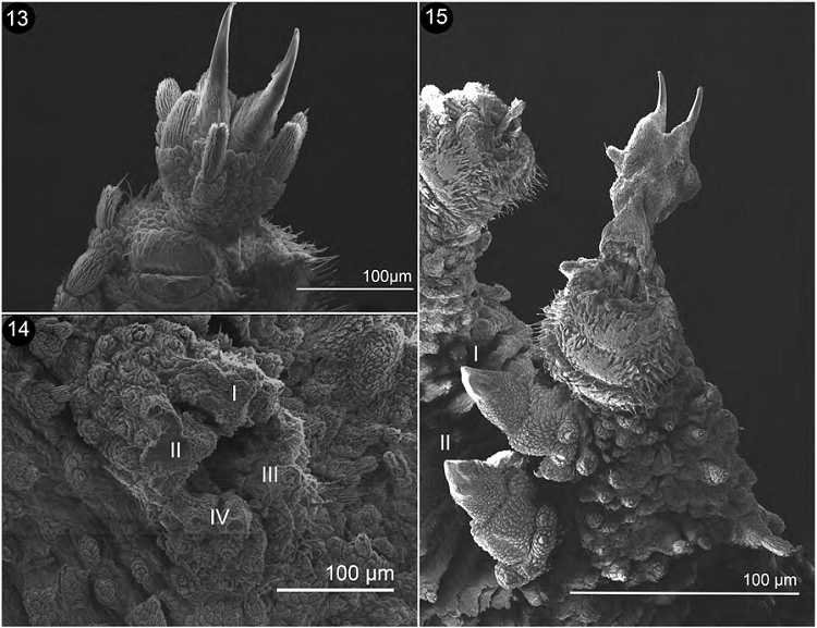 Antennae: Antennal tip has a terminal button followed by 9 rings equal in size; the antennal body has a total of 35 rings in both sexes. The 19 rings at the base have the presence of finger-like sensillae; 10 rings are wide and 9 are thin (Fig. 11). Frontal organ appears to begin on the eleventh ring of the antennal body to the base (Fig. 12). Mouth: opening is surrounded by lip papilla, the anterior-most is unpaired and smaller, and is followed by 7 pairs of lobes posterior ones, equal in size; all of them have small spines (Fig. 13); the spines and the lip papilla are noted by Wheeler (1898) on the drawings made in the original description. Inner and outer jaw blades, both have an enlarged principal tooth, and 1 or 2 smaller accessory teeth (Figs. 14, 15). The structure of the inner jaw blade, presents a diastema that separates the single principal tooth and the 2 accessory teeths, from 6 to 7 denticles, the second ones are bilobated (Fig. 15).