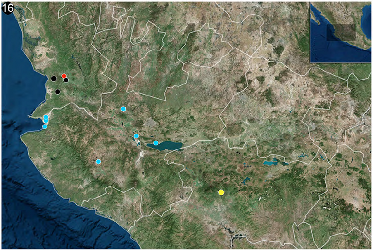 Geographical distribution: after our study, this species is now known to be present in 13 localities of 3 Mexican States: Jalisco, Nayarit, and Michoacán. Its distribution has a range of approximately 400 km (Fig. 16), including altitudes from the sea level to almost 1,600 m, with a preference for tropical habitats usually found close to water bodies.