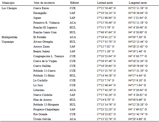 La región de Uxpanapa está ubicada en el sureste del estado de Veracruz, en el límite con los estados de Oaxaca y Chiapas dentro de las cuencas de los ríos Uxpanapa y Coatzacoalcos en el centro del istmo de Tehuantepec. Cuenta con zonas de llanuras, lomeríos y áreas montañosas, abarcando un gradiente altitudinal que va de los 50 a los 1,400 m snm (Rodríguez-Luna et al., 2011). La temperatura promedio es de 24.4 °C y tiene una precipitación de 3,640 mm (Ruiz-Guerra et al., 2014). Cuenta con una superficie de 473,704.30 ha de vegetación distribuidas en distintos sistemas. El área de estudio se encuentra ubicada en los municipios de Uxpanapa, Hidalgotitlán y Las Choapas. En estos municipios se seleccionaron 6 sitios de selva alta perennifolia, 4 de acahual de selva alta perennifolia, 6 plantaciones de hule (Hevea brasiliensis) y 8 cuevas (Tabla 1).