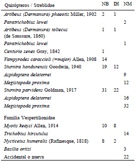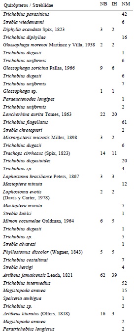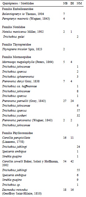 De los 378 murciélagos revisados, 251 ejemplares pertenecientes a 26 especies (83.8%) de las familias Natalidae, Mormoopidae, Phyllostomidae y Vespertilionidae, se encontraron parasitados. La familia Phyllostomidae fue la que presentó el mayor número de especies infestadas, siendo Artibeus jamaicensis (n = 62), Carollia sowelli (n = 54), Sturnira parvidens (n = 31), Lonchorhina aurita (n = 22) y el mormoópido Pteronotus parnellii (n = 27), las especies de murciélagos más abundantes (Tabla 2).