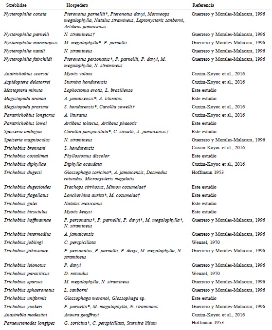 Comentarios: esta especie es un parásito característico de murciélagos del género Glossophaga. Cuxim-Koyoc et al. (2015) la reportaron parasitando a M. cozumelae en Yucatán. Es necesario recolectar más ejemplares en la región para corroborar la interacción de este parásito con D. rotundus, C. perspicillata y M. microtis.