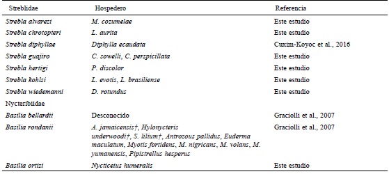 La diversidad de Streblidae y Nycteribiidae en México, actualmente está conformada por 56 y 7 especies, respectivamente (Colín-Martínez et al., 2018; Cuxim-Koyoc et al., 2015, 2016; Graciolli et al., 2007, 2016; Zarazúa-Cabajal et al., 2016). Esto representa el 56.5% de las especies de Streblidae que se distribuyen en Centroamérica incluyendo México (Dick y Miller, 2010) y el 13% de las especies de Nycteribiidae que se conocen para todo el Neotrópico (Graciolli et al., 2016).