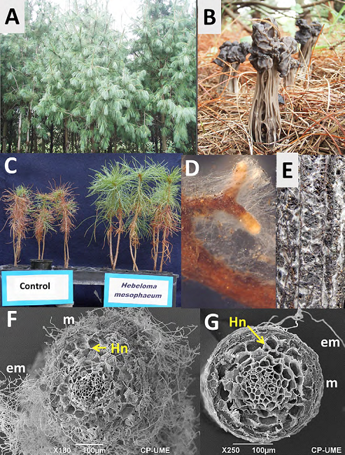 Pinus ayacahuite with Helvella cf. lacunosa: ectomycorrhizae dark brown in the base, becoming lighter toward the apex with orange-brown to red brown surface, whitish to cream tips in young stages, smooth, simple or dichotomous, from 0.3 to 0.7 mm in diameter and up to 10 mm in length, with a pseudoparenchymatous mantle and a well-developed. Hartig net entering the interstitial spaces of the first 2 or 3 layers of epidermal cells, clamps were not observed, and there was scarce, thick, stout, thick walled external hyphae and the rhizomorphs were absent (Fig. 1G). A similar morphoanatomical structure was described for Helvella spp. by Tedersoo et al. (2006).