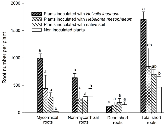 Total fine root counts were higher in the H. cf. lacunosa group with respect to the non-inoculated group (Fig. 2). The total root numbers were 3.65-fold higher in this treatment group versus control. In contrast, neither H. mesophaeum nor the native soil inoculated plants displayed differences compared with control conditions. The dead fine root percentages ranged by approximately 4.0, 16.1, 26.3 and 31.3% for plants inoculated with H. cf. lacunosa, H. mesophaeum and native soil and non-inoculated plants, respectively. Morphotyping showed that H. cf. lacunosa resulted in 2.2- and 3.5-times higher mycorrhized roots than H. mesophaeum and native soil, respectively (Fig. 2). The mycorrhizal colonization in H. cf. lacunosa, H. mesophaeum and native soil groups was 58.7, 52.3 and 40.9%, respectively after 2 years of growth in greenhouse conditions, whereas the non-inoculated plants displayed a low percentage of ectomycorrhizal colonization, mostly by Cenococcum cf. geophilum, according to morphotyping (4%). In the work presented here, ectomycorrhizal colonization for P. ayacahuite with the H. cf. lacunosa ascomycete and H. mesophaeum basidiomycete is presented for the first time (Fig. 1d, e, f, g).