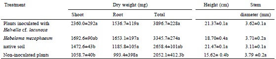 Plant growth. The highest aerial and total dry weight was observed on Helvella cf. lacunosa inoculated plants with respect to native soil and control groups (Tukey p ≤ 0.05) (Table 1). A similar trend was observed only for the total dry weight for H. mesophaeum versus non-inoculated plants (Tukey p ≤ 0.05) (Fig. 1c). In contrast, there were no differences in the root dry weight among inoculated and control groups. The plant heights for all the inoculation conditions exceeded those of the control group (Tukey p ≤ 0.05). An opposite trend was observed in stem diameter without significant differences between treatments (Table 1).