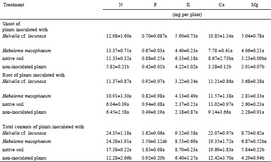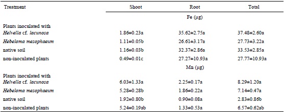 Micronutrients. In the case of Fe content, the trends resembled those in Ca. Moreover, the Fe contents in aerial zones of all of the inoculated groups exceeded those in the control group (Tukey p ≤ 0.05) (Table 3). Nonetheless, differences in the root and total Fe contents were absent among the groups. Differences in the aerial Fe of 3.79, 2.36 and 2.24 from Helvella cf. lacunosa, native soil and Hebeloma mesophaeum groups were detected against the controls (Table 3). In the case of Mn, there were no differences among groups regardless of the inoculum source (Table 3).