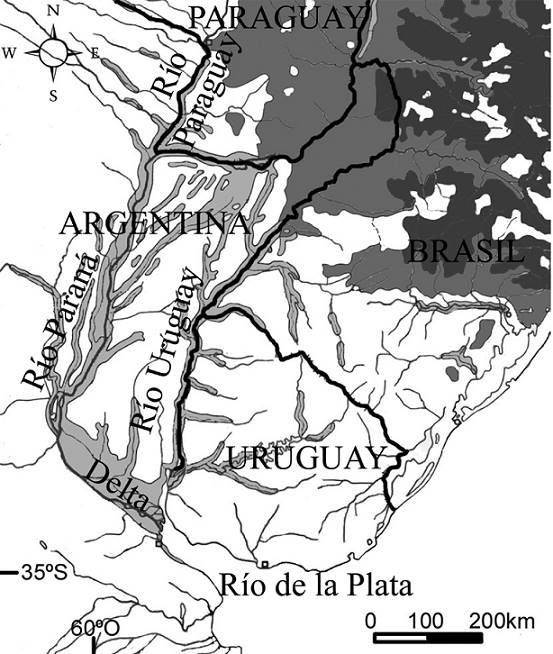 El sistema fluvial del Plata comprende 3 tributarios principales, los ríos Paraguay, Paraná y Uruguay, que confluyen en el Río de la Plata (Fig.1). Sus márgenes se encuentran cubiertos por bosques y selvas desde sus nacientes en zonas inter o subtropicales hasta su desembocadura en una zona templada dominada por pastizales (Cabrera y Dawson, 1944; Hueck, 1972; Menalled y Adamoli, 1995; Oakley et al., 2005). De tal modo, los ríos de esta cuenca sirven de ruta de movilidad para organismos terrestres subtropicales que de otro modo no alcanzarían la latitud del Río de la Plata (Ringuelet, 1955). En el pasado estos ríos pudieron haber servido de refugios o relictos para muchas especies durante distintas fases climáticas (Giraudo y Arzamendia, 2004), aunque la presencia de relictos en el sector sur de la cuenca es dudoso (Guerrero, 2014). Teniendo esto en cuenta se ha considerado que la composición de especies de los pajonales y bosques de la costa del Río de la Plata está condicionado fuertemente por la biota de su área fuente río arriba (Menalled y Adamoli, 1995). Se ha comprobado que la composición de especies de árboles entre el eje Paraguay-Paraná y el eje Uruguay es disímil, y los bosques conformados por árboles del primero, que tiene mayor influencia del Chaco Húmedo, alcanzan hacia el sur solo el sector superior y medio del delta del Paraná, mientras que los árboles del segundo habitan hasta las selvas marginales del delta inferior y el Río de la Plata (Burkart, 1957; Cabrera y Dawson, 1944; Menalled y Adamoli, 1995; Nores et al., 2005). Esto mismo se verifica para algunos vertebrados, por lo cual se ha propuesto que el curso del Paraná puede ser transicional entre el Chaco Húmedo y la provincia Paranaense (Arzamendia et al., 2015). No obstante, la dispersión actual de flora y fauna enmascara los resultados de procesos ecológicos y geomorfológicos del pasado que explican más parsimoniosamente algunos patrones de distribución (Arzamendia y Giraudo, 2009; Arzamendia et al., 2015).