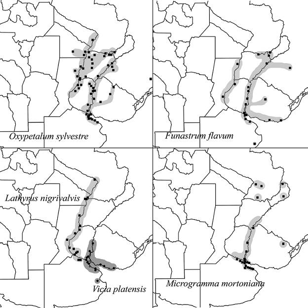 Las especies de la categoría restringida se encuentran asociadas con esta vegetación paranaense pero acotadas a los márgenes de los grandes ríos de la cuenca desde el límite sur de la provincia Paranaense sensu Morrone (2014) hasta el Río de la Plata (Fig. 3). Además de las especies aquí estudiadas de plantas epífitas y trepadoras, se conocen animales como vertebrados (Arzamendia y Giraudo, 2009) y arácnidos (Acosta, 2002; Ringuelet, 1959) endémicos restringidos a los humedales del sistema. Esto nos permitiría reconocer esta zona como un área de endemismo por la superposición casi completa de Oxypetalum sylvestre y Funastrum flavum (Fig. 3), lo cual deberá ser abordado en estudios posteriores. Este patrón de distribución es muy notable en numerosos organismos, como por ejemplo los árboles de la selva marginal del sistema fluvial, que tienen todos una distribución coincidente con el territorio que compone las selvas mixtas de la provincia Paranaense y se extienden hacia el sur siguiendo los ejes fluviales (e.g., Inga uraguensis, Pouteria salicifolia, Ocotea acutifolia y Terminalia australis) o solo el río Uruguay (Lonchocarpus nitidus) (Cabrera y Dawson, 1944; Menalled y Adamoli, 1995).