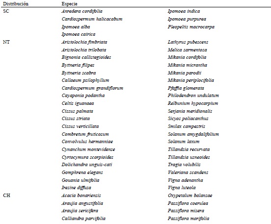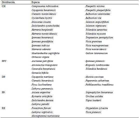 Se contabilizaron 108 especies de las cuales 12 son epífitas y 96 son plantas trepadoras. La Tabla 1 muestra la distribución de cada especie presente en el área de estudio. Al clasificar las distribuciones geográficas de cada taxón en las categorías reconocidas por las regionalizaciones utilizadas (Tabla 1) se observa una predominancia de taxones neotropicales de amplia distribución (40), seguido por especies de la subregión Chaqueña (35). El resto de las subdivisiones presentaron 7 especies cada una, con la excepción de la categoría “restringidas”, que solo presentó 5 especies. No se hallaron especies endémicas del Chaco Húmedo que alcancen el norte de Buenos Aires.