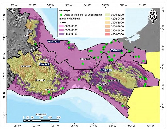 Patrón geográfico y ecológico de O. macrocalyx. Los datos sobre la presencia de esta especie en México son escasos, en este trabajo se encontró con mayor frecuencia en áreas protegidas en Chiapas, Tabasco y Veracruz; en remanentes de selva, pero también algunos individuos en sistemas agrícolas de subsistencia, en plantaciones agroforestales o como árboles aislados en pastizales cultivados o inducidos (González-Valdivia et al., 2012; INE, 1999; Inegi, 2013; Maldonado-Sánchez et al., 2016; Palma-López et al., 2015).