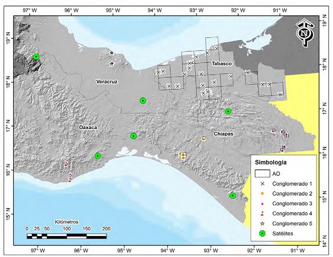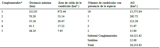 Los cálculos de las AO delimitaron 5 conglomerados: el conglomerado mayor se localiza dentro del estado de Tabasco, tiene una longitud de 312.05 km y el conglomerado menor, se sitúa en el estado de Veracruz, con una longitud de 28.19 km; así mismo, se identificaron 6 registros satélites en toda el área de distribución (Fig. 2). En la Tabla 3, se muestran las distancias máximas, las áreas de cada celda, el número de cuadrículas obtenidas por conglomerado y las áreas asignadas para las AO. La suma total de las áreas para la especie fue 16,133.62 km2, incluyendo 12 km2 que corresponden a los 6 satélites (Fig. 2).