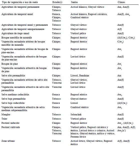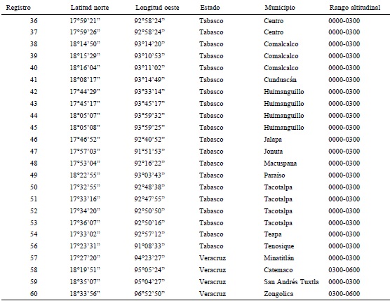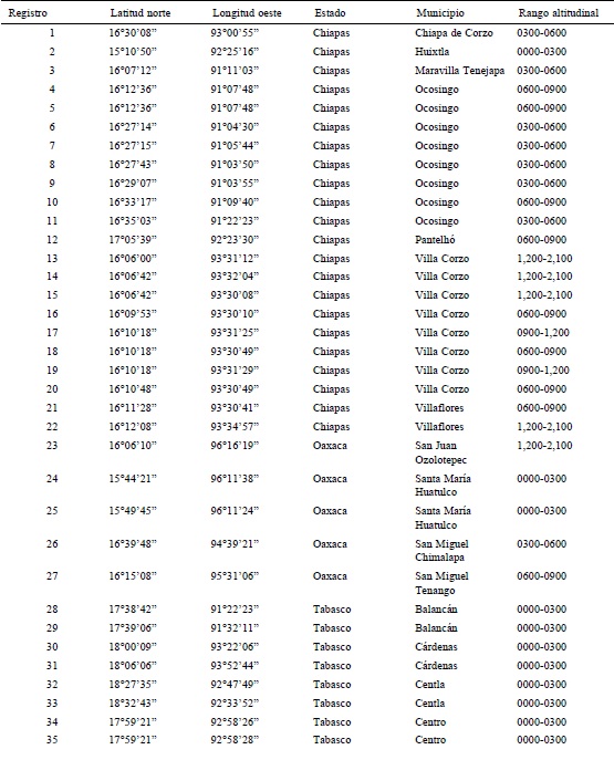 Para el análisis de patrón geográfico y ecológico, se realizó una revisión de ejemplares recolectados en los siguientes herbarios mexicanos: UJAT (Universidad Juárez Autónoma de Tabasco), CSAT (Colegio de Postgraduados Campus Tabasco), MEXU (Instituto de Biología de la Universidad Nacional Autónoma de México), XAL (Instituto de Ecología, Xalapa, Veracruz); Serbo, A.C. (Oaxaca, Oaxaca), CICY (Centro de Investigación Científica de Yucatán, A.C.), Herbario de El Colegio de la Frontera Sur, Unidad Chetumal (ECO-CH-H) y Herbario CEDESU de la Universidad Autónoma de Campeche. Además, en los herbarios virtuales: Botany Collections Smithsonian National Museum of Natural History (https://insider.si.edu/), Herbarium Missouri Botanical Garden (http://www.missouribotanicalgarden.org), Kew Herbarium Catalogue (http://apps.kew.org/herbcat/navigator.do), Virtual Herbarium the New York Botanical Garden (http://sweetgum.nybg.org/science/vh/). También se consultaron los registros del Inventario Nacional Forestal 1992-1994 (SARH, 1994) y del Inventario Nacional Forestal y de Suelos de México 2004-2007 (Conafor, 2012). Lo anterior se complementó con literatura científica y observaciones directas en campo para el estado de Tabasco. En los casos en que no se contó con coordenadas geográficas, se usó el programa GoogleTM Earth en unidades de sistema métrico universal transversal mercator (UTM) para ubicar los sitios de colecta. Se obtuvieron un total de 60 registros para México: a cada registro se le asociaron valores de clima, suelo, altitud, ecosistemas o agroecosistemas obtenidos de la base de datos de Inegi (2013, 2015) y de la Conabio (2001a, b).