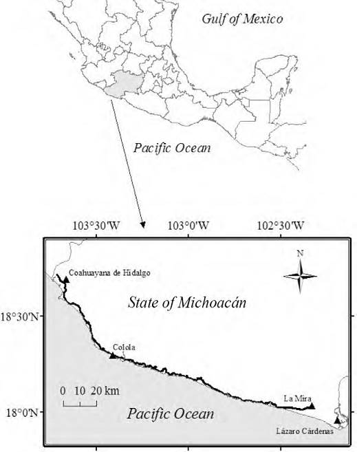 This study was conducted on the road running along the Pacific coastal plain in the state of Michoacán, western Mexico (Fig. 1). This two-lane road crosses the municipalities of Lázaro Cárdenas, Aquila and Coahuayana, which are located within the physiographic province of the Sierra Madre del Sur (Correa, 1974). The specific section of the road we studied was the 210 km located between the towns of Acalpican and Coahuayana (Fig. 1). This section of the road is surrounded by a modified landscape consisting of mostly small human settlements (50-200 inhabitants) with the exception of La Placita de Morelos (1,500 inhabitants), tracts of well-conserved forest, secondary vegetation and lands destined to cattle pasture and to a variety of crops. Monthly average temperature in this region is 26 °C and annual precipitation ranges from 600 to 800 mm. Main vegetation types found in the coastal region of Michoacán include: a) tropical dry forest, b) tropical sub-deciduous forest, c) riparian forest, d) savanna, and e) wetlands.