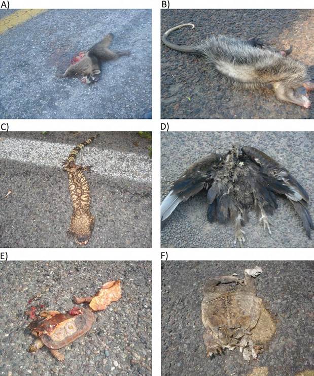 We recorded a total of 314 animals killed as the result of collisions with vehicles during 10 one-day surveys. This represents an approximate of 31.4 deaths per day, which if multiplied by 365 gives a rough estimation of 11,461 animal kills per year. Our figures may represent an overestimation or underestimation depending on the relative impact of 2 non-exclusive factors: 1) one-day surveys were not consecutive always, the possibility exists that in some instances, daily records reflected the mortality accumulated over the course of several days, and 2) it has been shown that carcass removal by scavengers can be extremely fast and effective, causing disappearance of a large proportion (60-97%) of killed animals within 36 hours (Antworth et al., 2005; Teixeira et al., 2013).