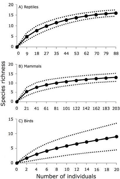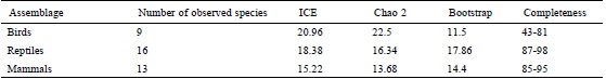 Moreover, we assessed the completeness of the inventory of each vertebrate group by calculating the percentage that the total number of species recorded represented the species richness estimated for each group using 3 non-parametric estimators: incidence-based coverage estimator (ICE), Chao 2 and bootstrap. We used software EstimateS ver. 9.1 to calculate these richness estimators (Colwell, 2013).